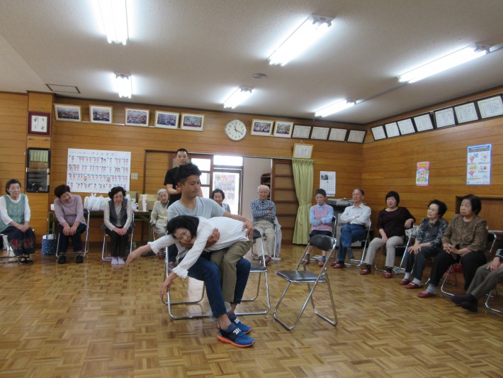お隣の方とペアを組んで「立ち上がり」の介助方法を学びます。