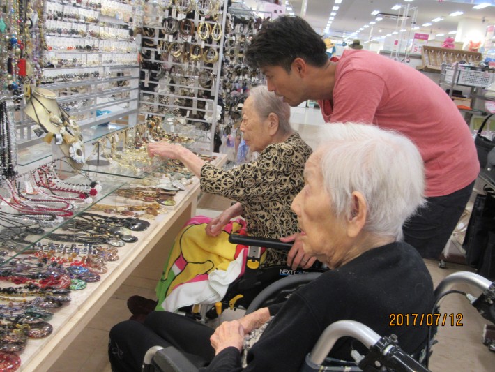 アクセサリーを選んでいる入所者様&イケメン介護士@豊川イオン