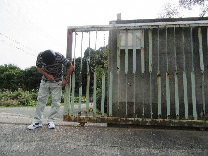 門を前に何やら相談している施設長とスーパーな業務員さん