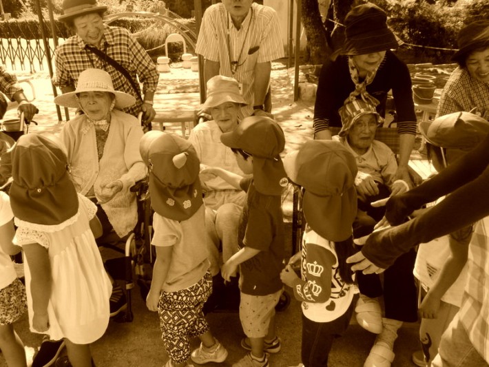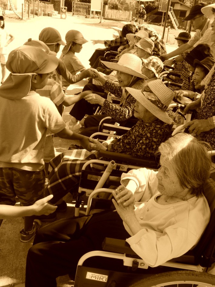 手に触れて「パワー」と「笑顔」をいただきます@千両保育園