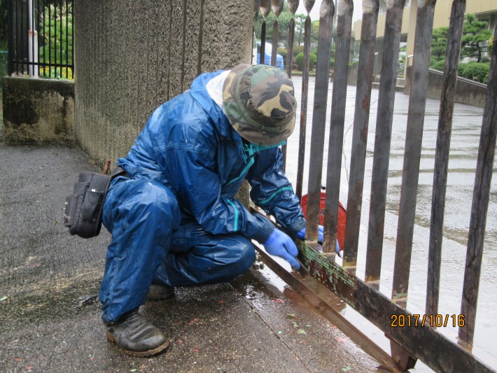 雨の中でもサビ取りをしている業務員さん。